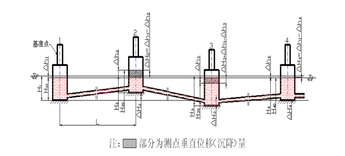 假設被測物體測點1作為基準點,測點2的地基下沉,測點3的地基上升,測點4的地基不變等等,當系統內液面達到平衡靜止后形成新的水準面▽i0,則各測點連通容器內的新液位值分別為:H1、H2、H3、H4,各測點液位變化量分別計算為:△h1=H1-H10、△h2=H2-H20、△h3=H3-H30、△h4=H4-H40,當選定測點1為基準點,則其它各測點相對基準點的垂直位移(沉降量)為:△H2=△h1-△h2、△H3=△h1-△h3、△H4=△h1-△h4,如下圖: