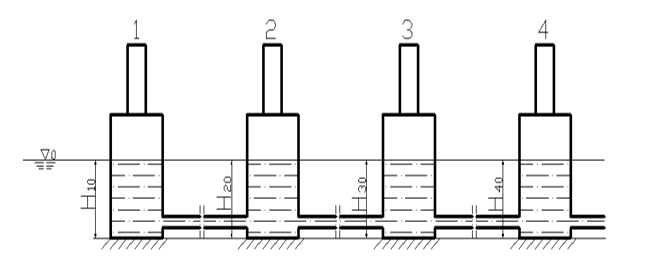 靜力水準系統又稱連通管水準儀,系統至少由兩個觀測點組成,每個觀測點安裝一套靜力水準儀。靜力水準儀的貯液容器相互用通液管完全連通,貯液容器內注入惰性液體,當液體液面完全靜止后系統中所有連通容器內的液面應同在一個大地水準面上,此時每一容器的液位由傳感器測出,即初始液位值分別為:H10、H20、H30、H40、如下圖: